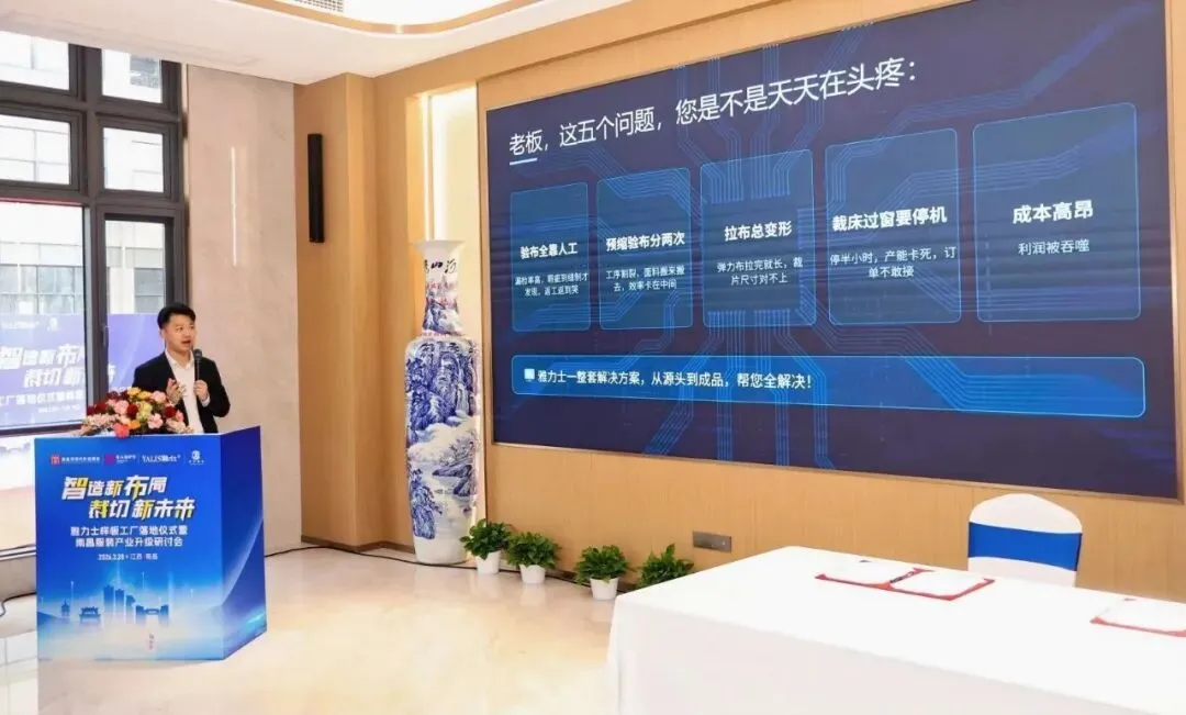 我会秘书长邓浩围绕验布依赖人工、预缩与验布分离、拉布变形、裁床过窗停机、成本高昂等五大痛点,介绍了雅力士自动拉布机、自动裁床机、AI智能验布机、智能验布预缩一体机及智能裁剪整线方案,并分享了设备协同带来的整体效益。