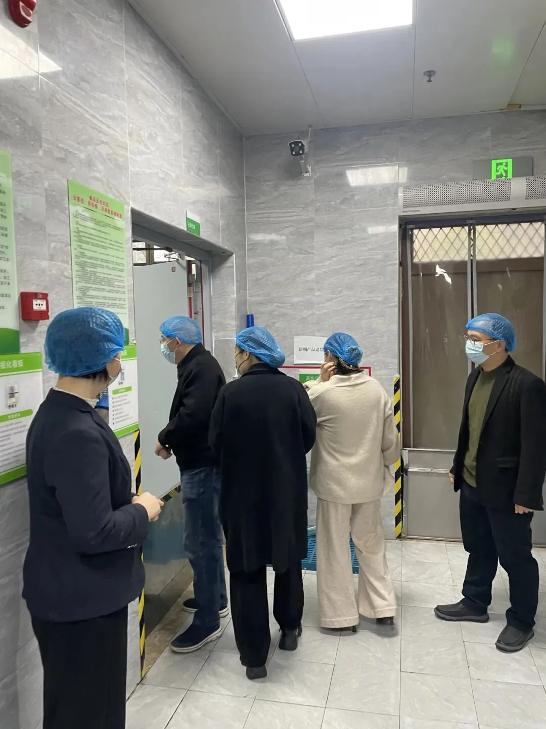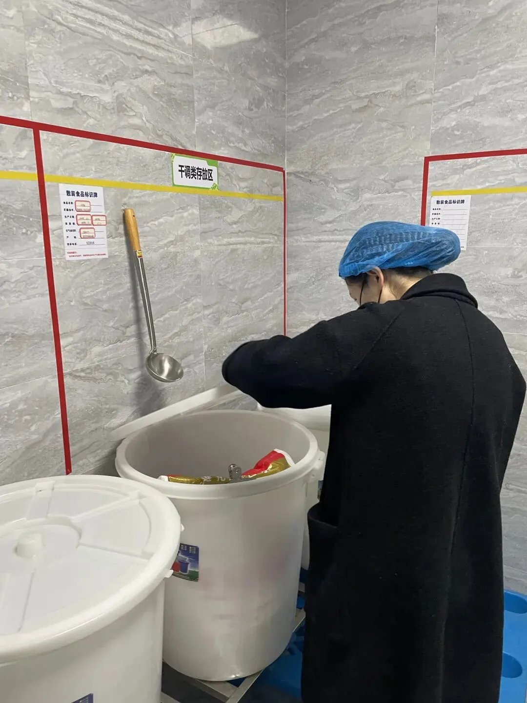 大家仔细核验食材采购凭证、检验报告、消毒记录、从业人员健康证等台账资料,重点查看食材储存条件、操作规范、卫生环境及餐食保温情况,现场就菜品搭配、餐食供应、明厨亮灶视频监控及回访等问题与食堂负责人深入交流、提出建议。