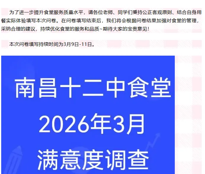 为了进一步提升食堂服务质量水平,3月9日—11日,学校开展了食堂满意度调查问卷活动。