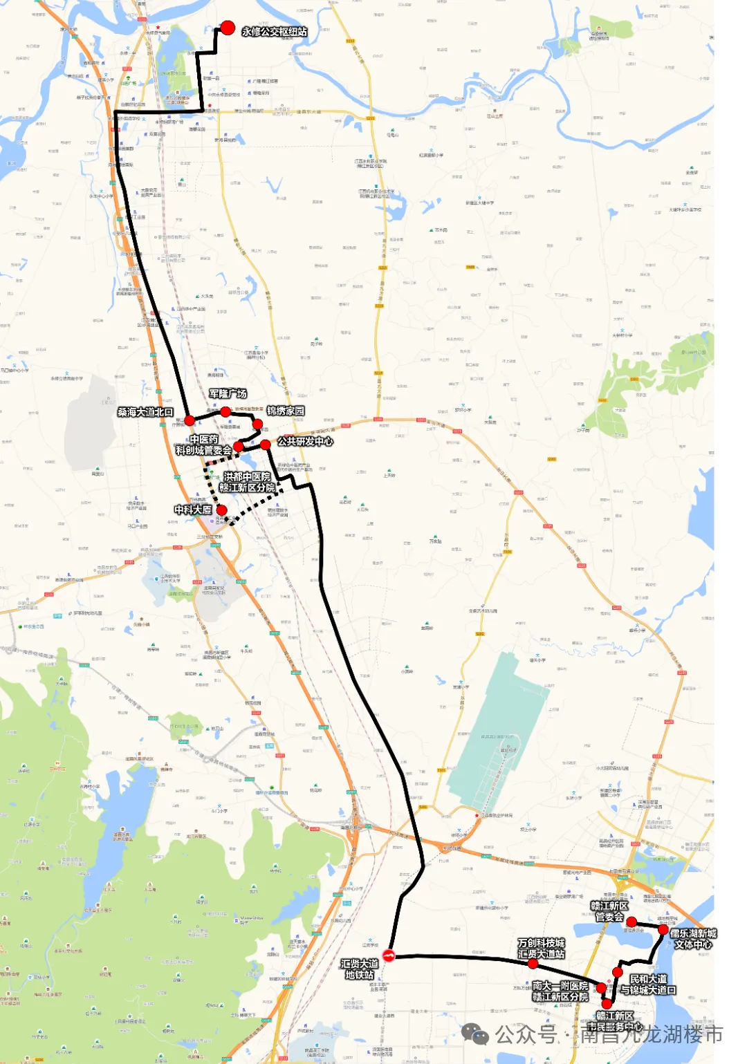 据了解,该公交线路从永修汽车站始发,经前塘路(虾街)、赣新大道至南昌汇贤大道地铁站,全程约26公里,沿途站点设置为永修虾城公交站、法制广场公交站(政府南广场东侧、金融大厦西侧)、汇贤大道地铁站,单程运行时间约30分钟。