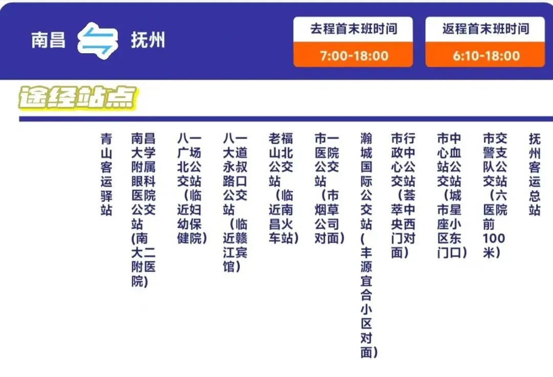 发车时间:7:00、7:40、8:20、9:10、10:00、11:00、13:00、13:40、14:20、15:40、17:00、18:00行驶线路:青山客运驿站→南昌大学附属眼科医院公交站(南大二附院旁)→南昌八一广场北公交站(省妇保医院旁)→南昌八一大道永叔路口公交站(赣江宾馆旁)→南昌老福山北公交站(南宾国际金融大厦旁)→抚州市一医院公交站→瀚城国际公交站→抚州市行政中心公交站→抚州市中心血站公交站→抚州市交警支队公交站→抚州客运总站发车时间:6:10、7:00、8:00、10:00、10:40、11:20、13:00、14:00、15:00、16:00、17:00、18:00行驶线路:抚州客运总站→抚州市交警支队公交站(六医院前100米)→抚州市中心血站公交站(城市星座小区东门口)→抚州市行政中心公交站(荟萃中央西门对面)→瀚城国际公交站(丰源宜和小区对面)→抚州市一医院公交站(市烟草公司对面)→南昌老福山北公交站(老福山八一大道口)→南昌八一大道永叔路口公交站(老长运原售票大厅门口)→南昌八一广场北公交站(财富广场)→南昌大学附属眼科医院公交站(省中医院)→青山客运驿站发车时间:7:00、9:30、11:30、13:00、14:00、17:40行驶线路:青山客运驿站→南昌大学附属眼科医院公交站(南大二附院旁)→南昌八一广场北公交站(省妇保医院旁)→南昌八一大道永叔路口公交站(赣江宾馆旁)→南昌老福山北公交站(南宾国际金融大厦旁)→临川一中公交站→临川区政府北门公交站→临川二中公交站→源野山庄→六家桥乡人民政府→变电小镇→县人民医院公交站→县农商行公交站→人人乐超市→崇仁客运中心站发车时间:5:10、9:00、10:30、13:00、15:00、17:30行驶线路:崇仁客运中心站→人人乐超市(临近农贸市场)→县农商行公交站(人民大道中石化加油站旁)→县人民医院公交站→变电小镇→六家桥乡人民政府→源野山庄→临川二中公交站(卫生执法大队门口)→临川区政府北门公交站(尚书第小区对面)→临川一中公交站(一中南门正对面)→南昌老福山北公交站(老福山八一大道口)→南昌八一大道永叔路口公交站(老长运)→南昌八一广场北公交站(财富广场)→南昌大学附属眼科医院公交站(中医院)→青山客运驿站。南昌市至鄱阳县城际公交车2023年12月25日正式开通南昌至鄱阳城际公交班线遵循“大容量、低票价、高密度”的运营模式,计划投入16台47座纯电动车,票价3 0元,每天从南昌发出20个班,从鄱阳返回20个班。