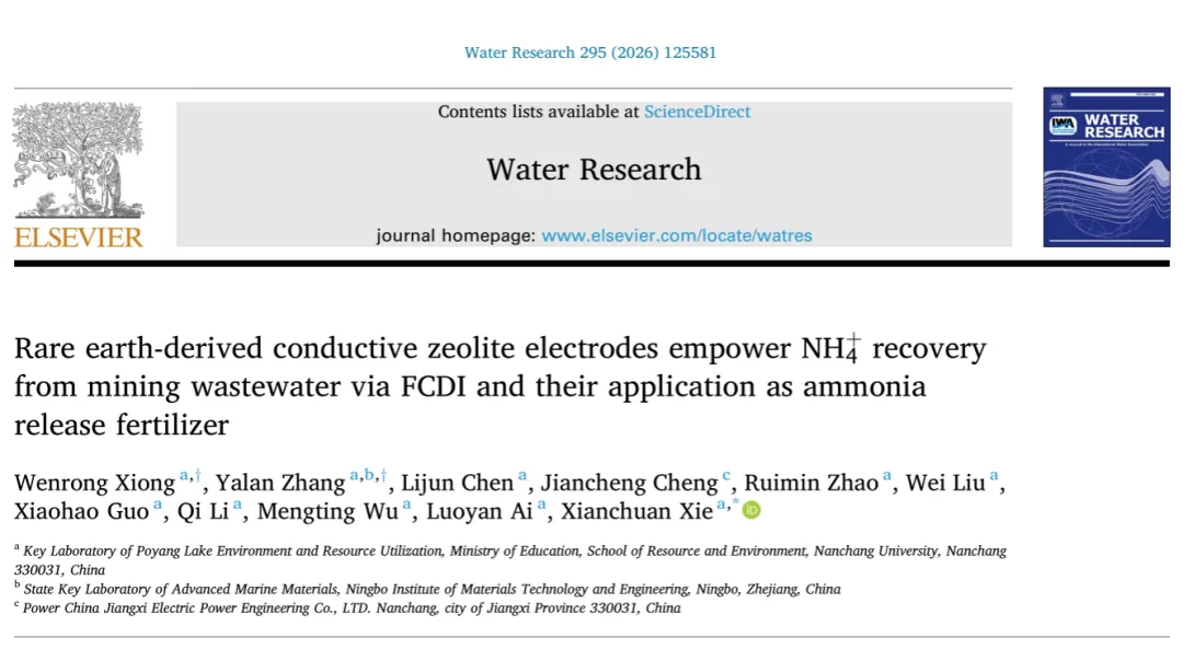 近日,南昌大学谢显传课题组在Water Research(中科院一区,影响因子12.4)发表了题为“Rare earth-derived conductive zeolite electrodes empower NH₄⁺ recovery from mining wastewater via FCDI and their application as ammonia release fertilizer”的研究论文(DOI: 10.1016/j.watres.2026.125581),稀土开采过程中会产生大量尾矿和高氨氮废水,既是环境隐患,也是资源浪费。针对这一难题,该研究首次以稀土尾矿为原料,通过高温煅烧和水热反应,成功制备出导电沸石材料,并将其作为流动电极电容去离子技术(FCDI)的电极材料,成功实现稀土矿山废水中铵根离子(NH₄⁺)的高效去除、回收及资源化利用,构建了矿业 “尾矿利用 - 废水修复 - 农业应用” 的闭环循环经济模式,为稀土行业绿色可持续发展提供了全新解决方案。