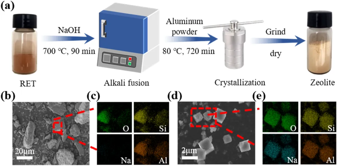 图1a 为稀土尾矿(RET)基导电沸石的合成工艺路线,以赣州离子型稀土尾矿为原料,经 100 目过筛、研磨后与 NaOH 按 1:1 混合,700℃煅烧 90min 完成碱熔,再添加 0.1/0.3/0.5g 铝粉调控硅铝比,经 80℃水热反应 12h、洗涤至上清液电导率小于40μS/cm、105℃干燥并 200 目过筛后,制得Al₀.₁、Al₀.₃、Al₀.₅系列导电沸石;图1b-e为形貌与元素分布表征:原始 RET 呈不规则团聚形貌(1b),元素分布不均(1c);而最优性能的Al₀.₃导电沸石呈现规则紧密的多面体晶型(1d),O、Si、Na、Al 元素均匀分布(1e),为典型 A 型沸石结构,证实晶型合成成功。