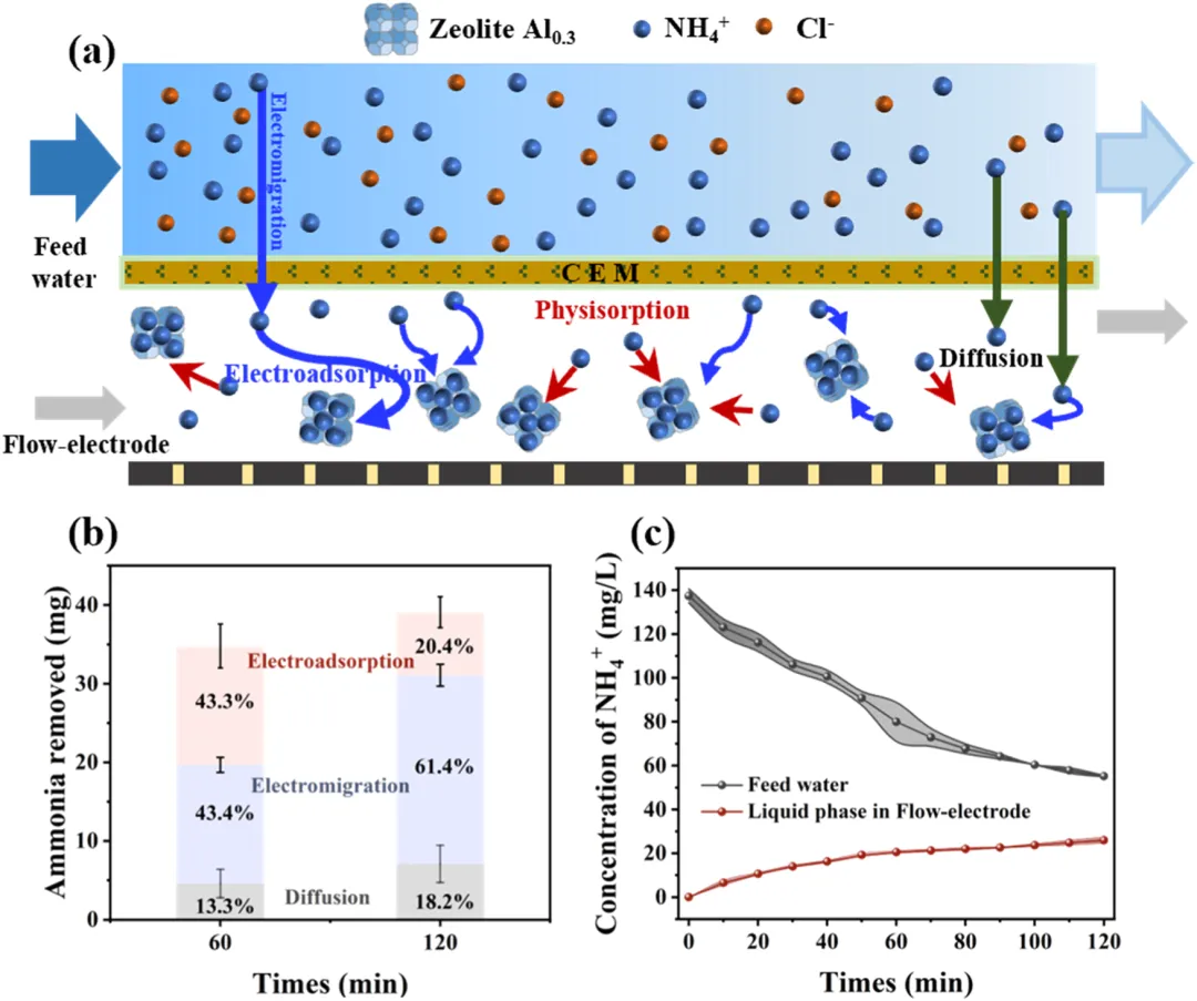 图4a揭示了NH₄⁺在FCDI系统中的迁移机制。整个过程包括扩散、电迁移和电吸附三个阶段:在浓度梯度驱动下,NH₄⁺通过CEM从淡化室扩散到电极室;在电场作用下,带正电的NH₄⁺加速向阴极迁移;到达电极室后,NH₄⁺被导电沸石通过离子交换和电吸附作用捕获。其中,电迁移和电吸附是主导机制,分别贡献了61.4%和20.4%的去除率,扩散仅贡献18.2%。在实际稀土矿山废水处理中(图4b),该系统运行2小时后,总NH₄⁺去除率达到90.49%,其中20.48%富集在电极溶液中,79.52%被导电沸石电极直接吸附储存(图4c)。这一结果证实了导电沸石电极的高吸附容量,为提升稀土尾矿利用率和有效处理废水中的氨氮提供了可行方案。