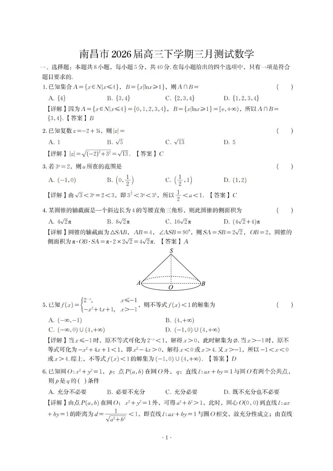 南昌市2026届高三下学期三月测试数学解析