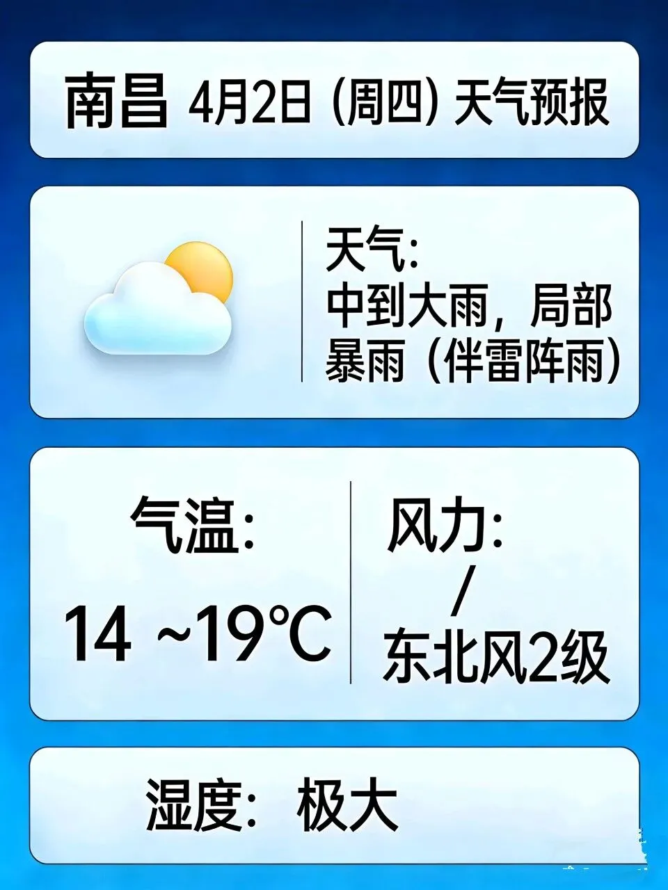 南昌 明天(4月2日,周四) - 天气:中到大雨,局部暴雨(伴雷阵雨),14~19℃- 风向风力:东风2级,湿度极大- 出行:带伞+防雨衣;驾车慢驶、避积水与强对流时段- 穿衣:长袖+薄外套+长裤,穿防水防滑鞋