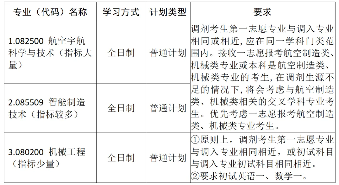 2.请有调剂意向的考生于2026年4月8日登陆中国研究生招生信息网(https://yz.chsi.com.cn/)调剂我校082500航空宇航科学与技术、080200机械工程、085509智能制造技术专业