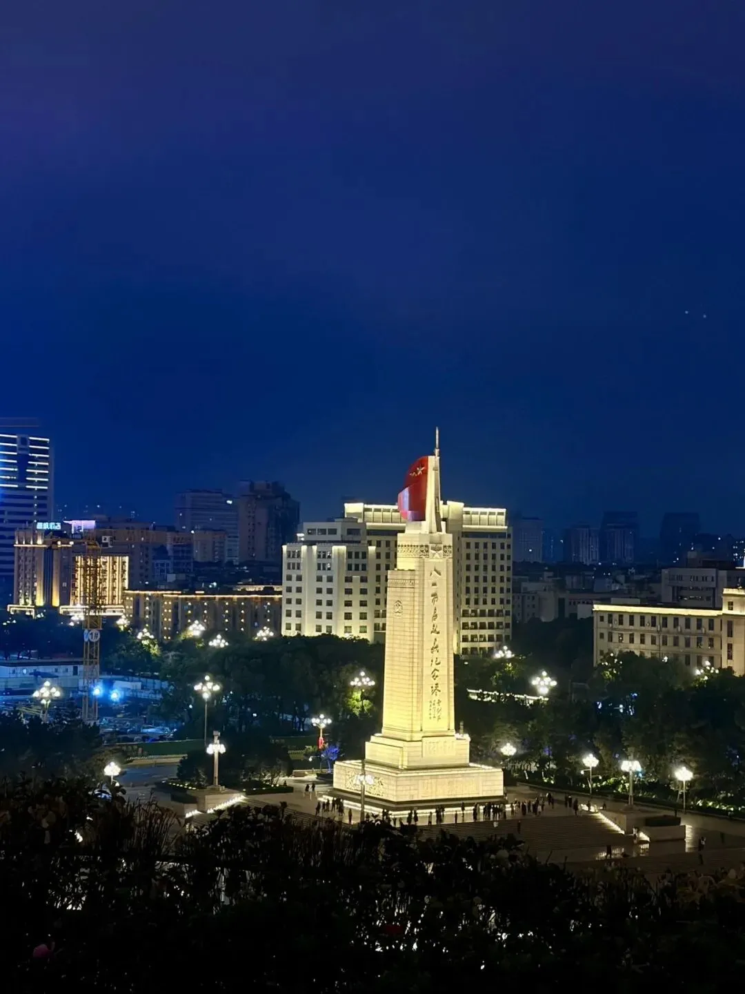 八一南昌起义纪念塔,在夜色中巍然耸立,红星闪耀,照亮了整座城市。