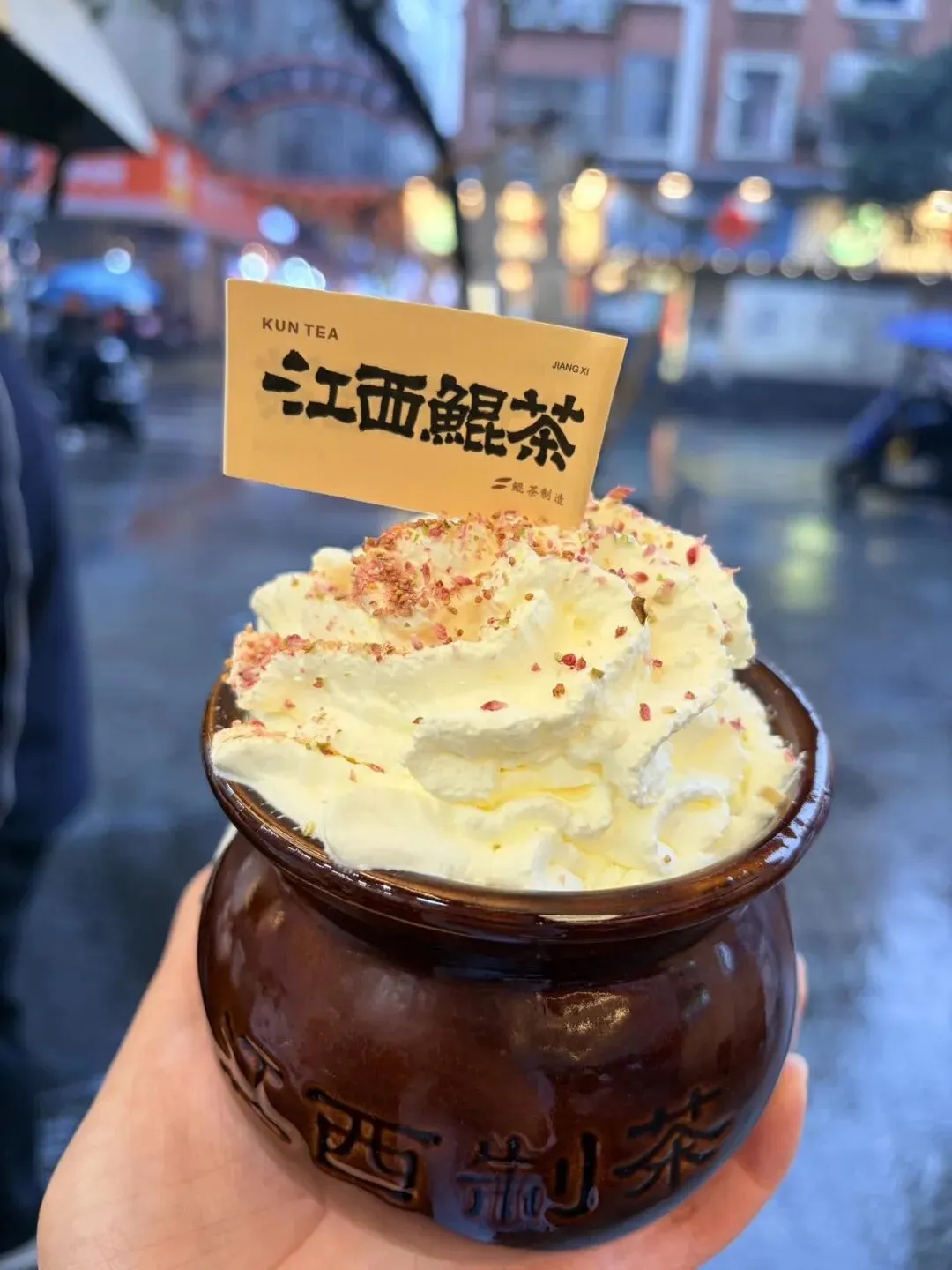 江西鲲茶的瓦罐奶油顶,把江西特色装进罐子里,绵密的奶油撒上玫瑰碎,甜香与茶香交织;
