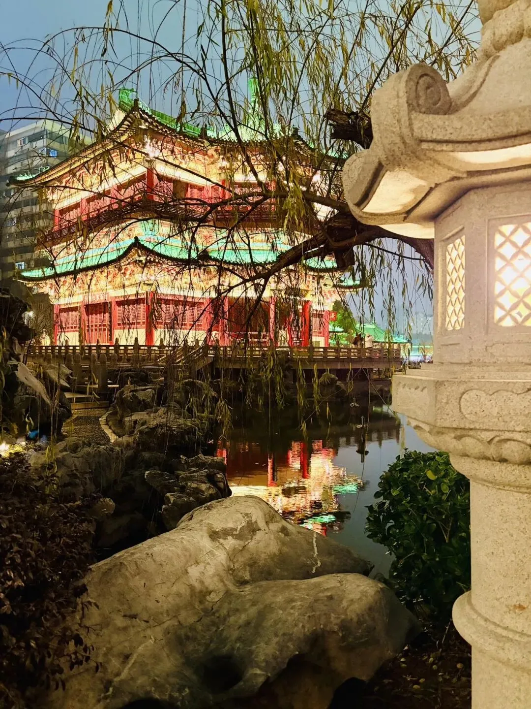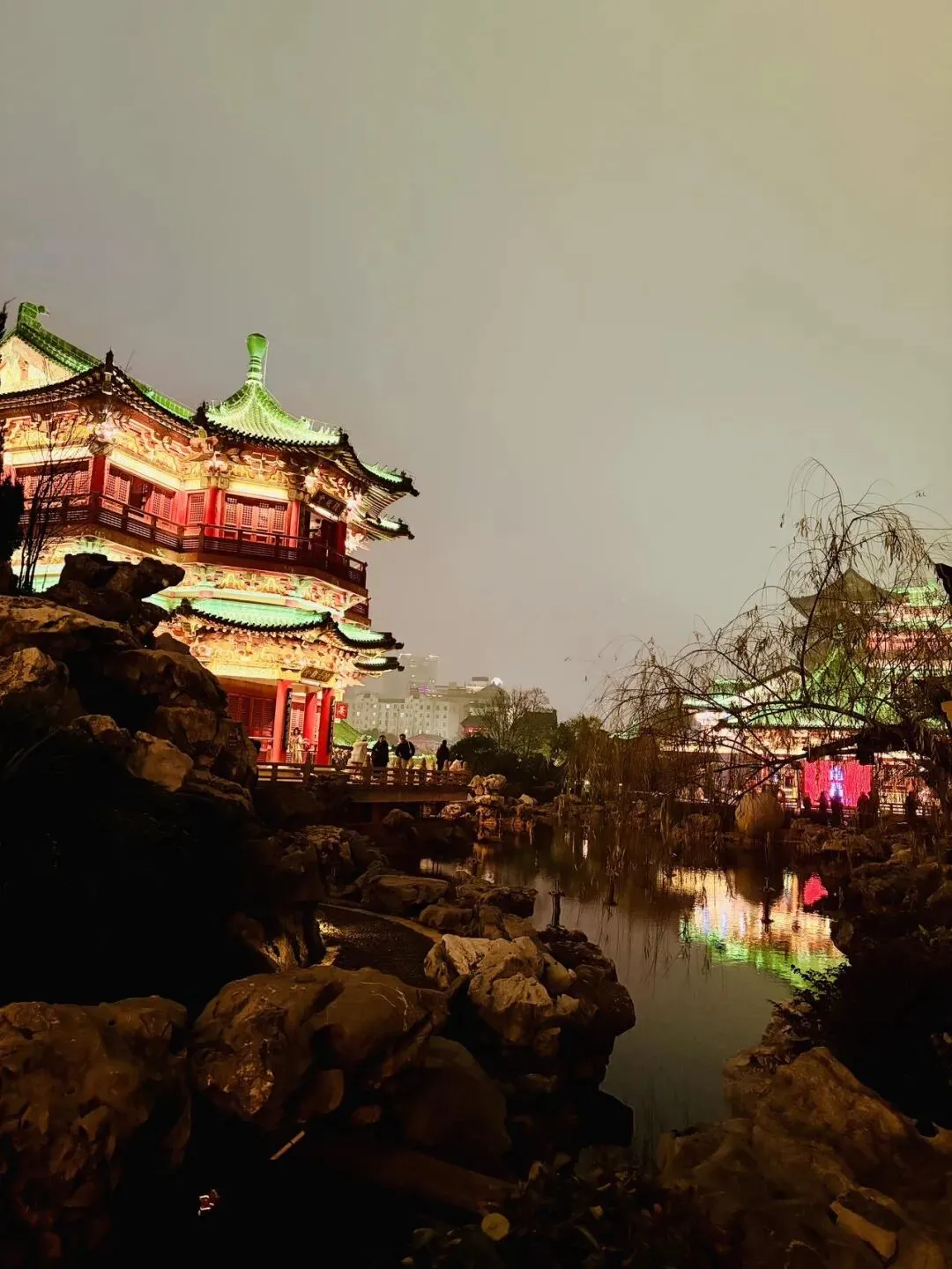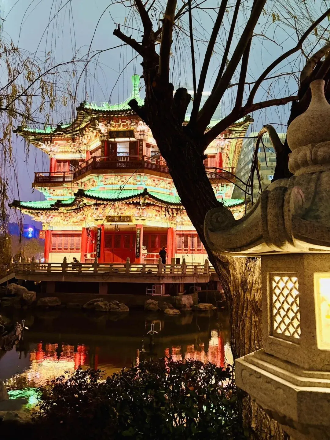 夜幕下的滕王阁,飞檐翘角在灯光中熠熠生辉,柳丝垂落,倒映在池水中,仿佛穿越回王勃挥笔写下千古名篇的盛唐。