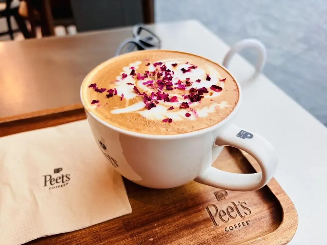 Peet's的玫瑰拿铁,拉花精致,玫瑰花瓣点缀,是南昌的温柔甜意。