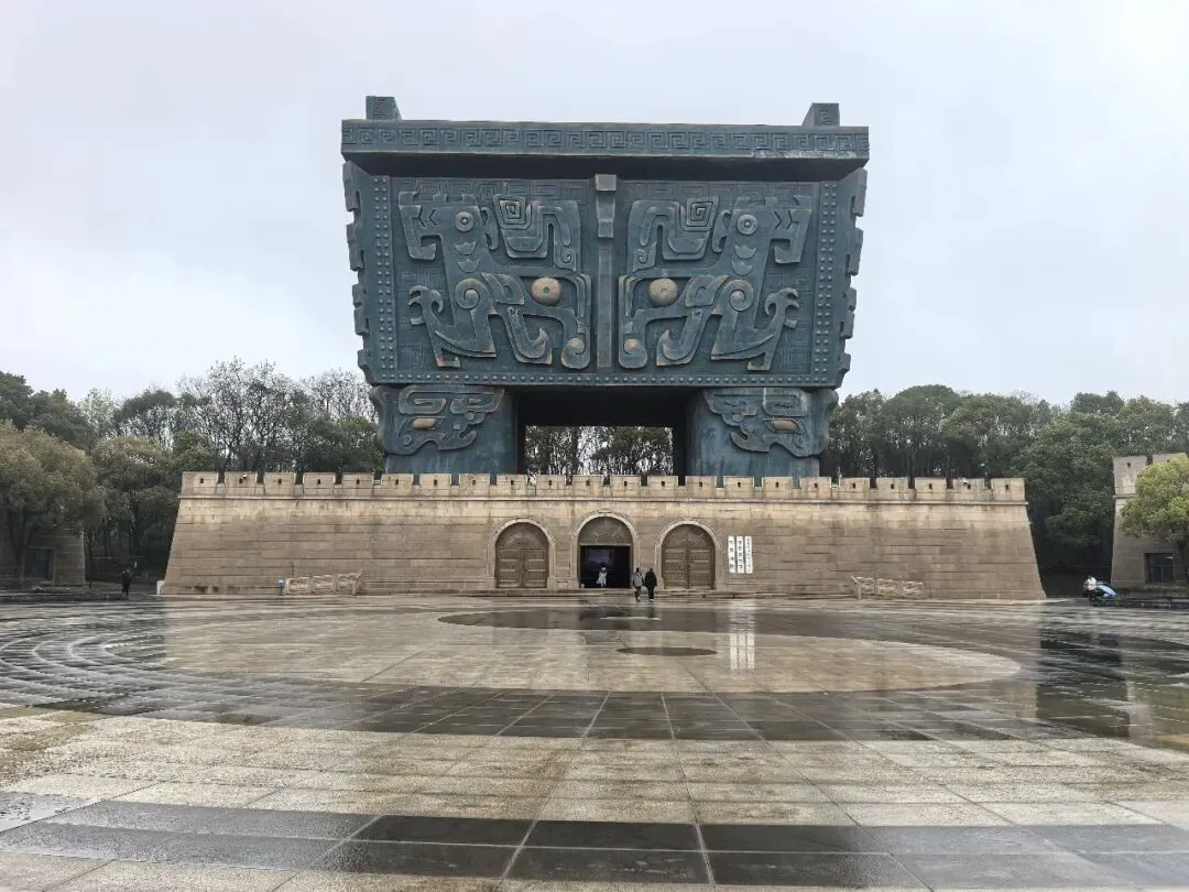 行至台阶尽头,视野豁然开朗,巨大的八卦广场徐徐铺展。广场正中,便是博物馆主体建筑——一座高达三十九米的青铜巨鼎,鼎身赫然镌刻“傩冠”二字,庄重雄浑。