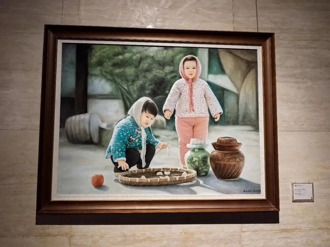 画作以细腻写实笔法,定格旧时光里动人的乡野童趣:两个身着传统棉服的孩童是灵魂所在。蹲坐着的专注摆弄竹筛中的物件,眉眼间尽是孩童独有的认真与好奇;站立着的裹着花袄,眼神澄澈明亮,笑意天真烂漫,望向观者。