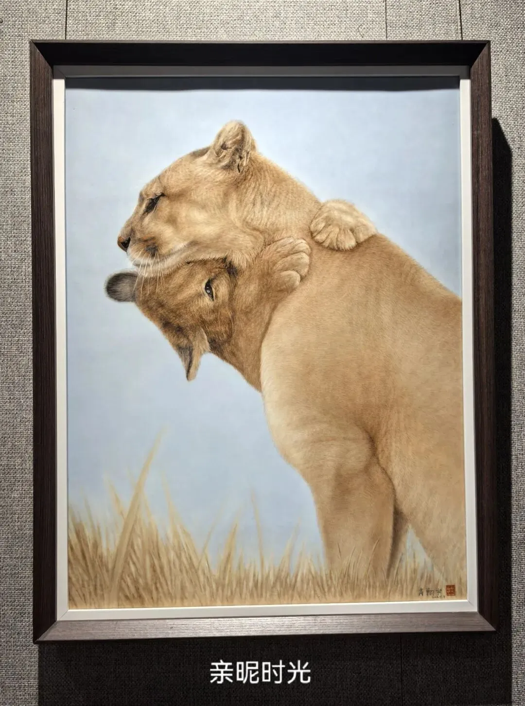 画作褪去雄狮惯有的霸气威慑,只定格雌狮与幼狮相依相拥的瞬间:幼狮将脸颊轻贴母狮脖颈,前爪自然环抱,神态慵懒依恋;雌狮侧首回望,眉眼间满是宠溺安然,身形线条柔和舒展,尽显母性包容温情。