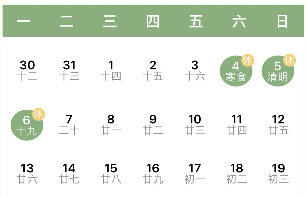 2026年4月4日(星期六)至4月6日(星期一)放假,共3天。