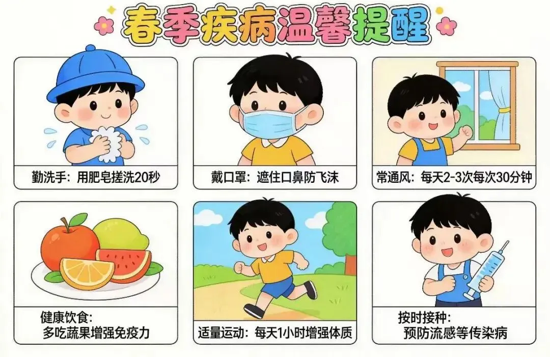 1.春季是传染病高发季节,如手足口病、诺如病毒、急性肠胃炎等,家长要教育孩子勤洗手,多喝开水,加强锻炼身体,少到人口密集的地方玩耍,有效预防春季常见传染病;