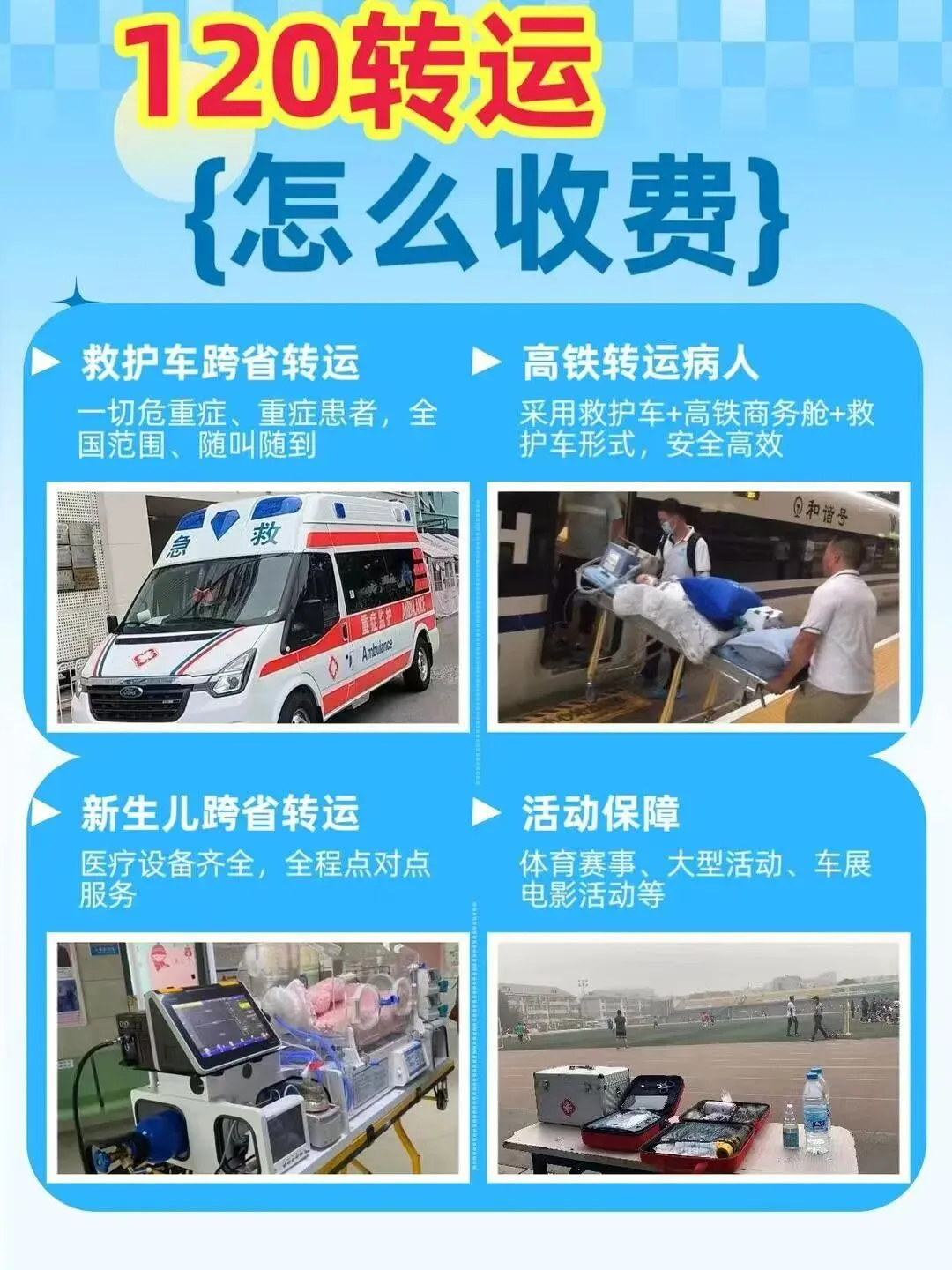 我们是救护车出租转运公司,120救护车接送病人预约护送。24小时为术后康复、危重患者及跨区域就医人群提供专业医疗转运服务,提供120救护车转运出租‖救护车转运‖私人120救护车(非急救)‖跨省长途转运‖危重病人转运‖市内转运‖术后康复病人转运‖高铁病人转运‖患者返乡‖大型活动赛事保障‖配备ICU设备:呼吸机▪心电监护仪▪吸痰器•微量泵•氧气▪急救药箱▪专业医护团队非急救120救护车转运24小时服务热线:15088098120(←长按复制,微信同号)官方网站:http://www.120ajhs.com/