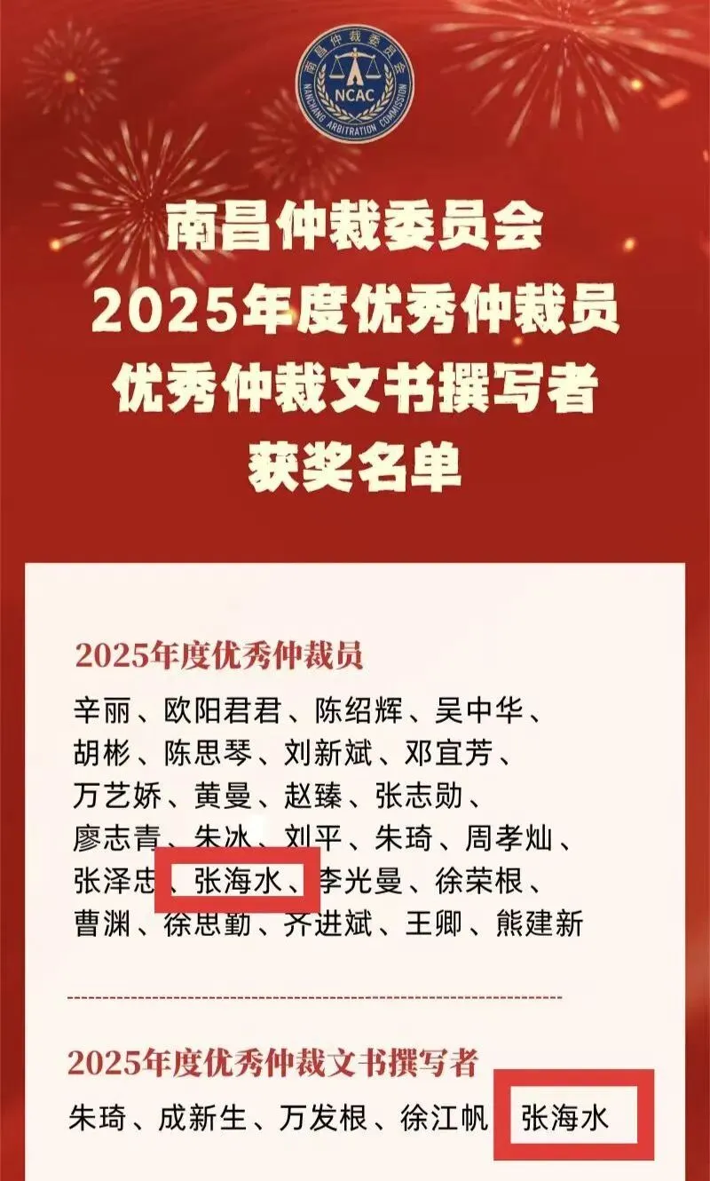 张海水律师现任南昌仲裁委仲裁员,凭借在仲裁工作中的卓越表现,一举荣获“2025年度优秀仲裁员”及“2025年度优秀仲裁文书撰写者”两项荣誉。