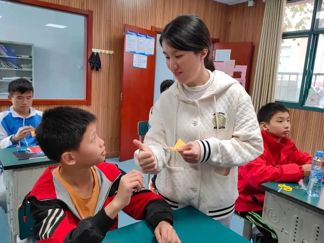 在折纸制作过程中,舒莹一边示范一边对折纸的每一个步骤都做了详细的讲解,孩子们在边学边操作的过程中对双正方形、双三角形、双菱形等折法有了最基本的了解。