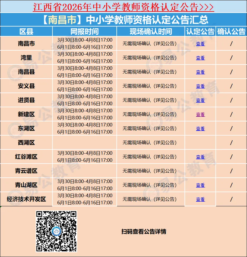 根据《中华人民共和国教师法》《教师资格条例》《〈教师资格条例〉实施办法》《教育部关于印发〈中小学教师资格考试暂行办法〉〈中小学教师定期注册暂行办法〉的通知》(教师〔2013〕9号)《江西省2026年中小学教师资格认定公告》及《南昌市2026年上半年中小学教师资格认定公告》等有关规定,现就红谷滩区2026年上半年中小学教师资格认定工作有关事项公告如下: