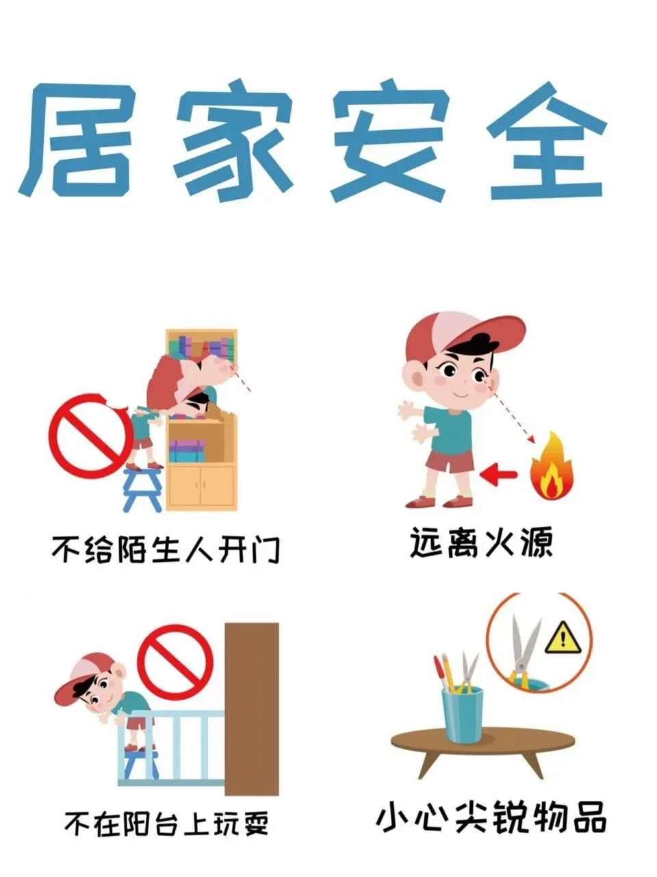4.规范用电、用气,教导孩子不随意触碰插座开关。提醒孩子远离窗台阳台,谨防高空坠落。孩子独自在家时,不给陌生人开门。