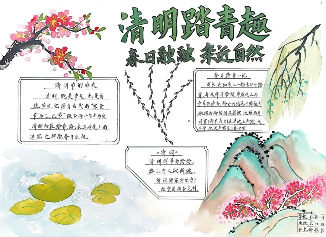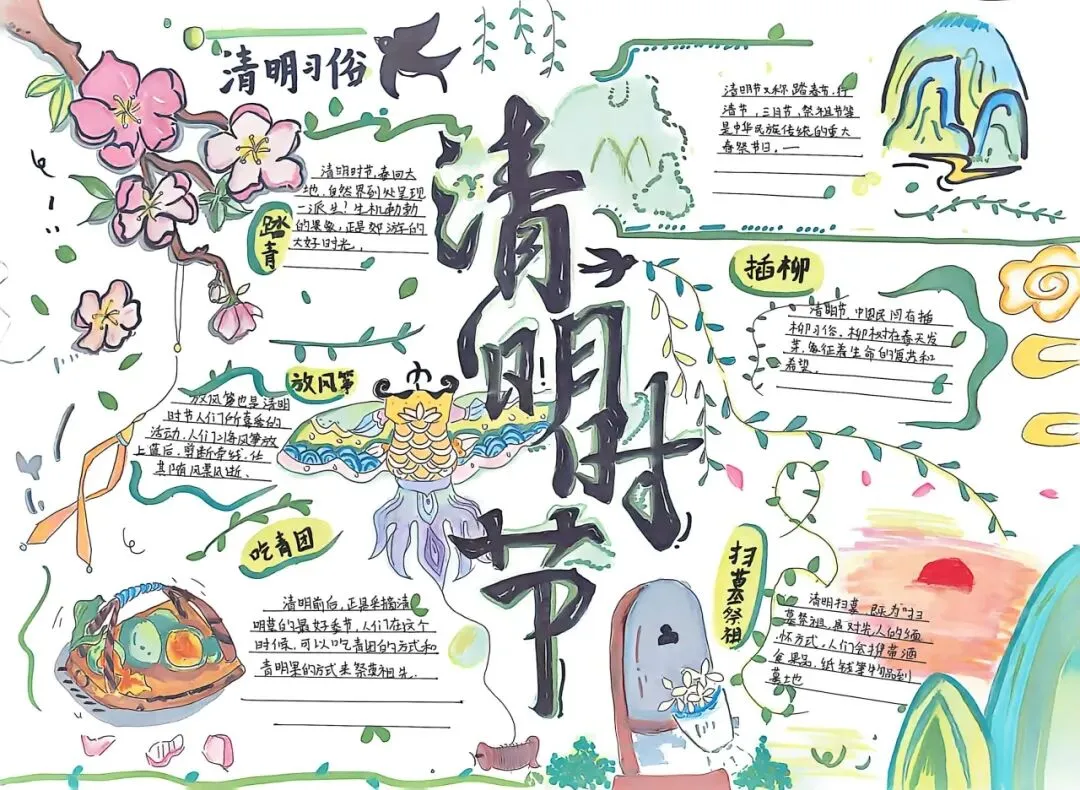 与此同时,学校还组织全体学生开展了“清明祭英烈”主题手抄报绘制活动。同学们利用课余时间,搜集资料、精心设计,用手中的彩笔描绘出心中的清明印象。一幅幅作品主题鲜明、图文并茂,有的介绍清明节的传统文化习俗,有的书写革命先烈的感人故事,有的则用工整的字迹表达对先辈的崇敬与追思。清明小报不仅展示了学生们的艺术才华,更成为传承红色基因的生动载体,让爱国主义精神在笔尖流淌,在心间扎根。