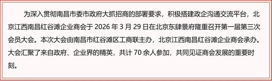 时间:2026年3月29日地点:北京东肆景府主办单位:南昌市红谷滩区工商联承办单位:北京江西南昌红谷滩企业商会