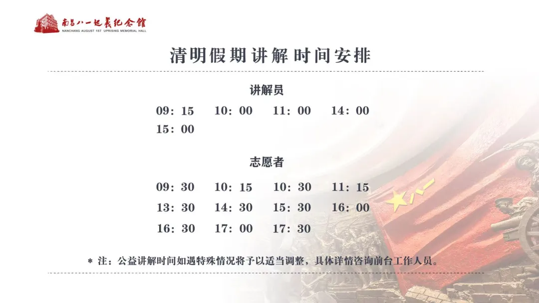 4月4日至6日,我们即将迎来清明假期,为满足广大游客朋友在清明假期期间缅怀革命先辈、参观学习红色文化的需求,2026年4月4日至6日(周六至周一)南昌八一起义纪念馆正常开放。开馆时间为9:00,停止入馆时间为20:30,闭馆时间为21:00(17:00以后开放区域为陈列大楼,其余旧址均不开放)。