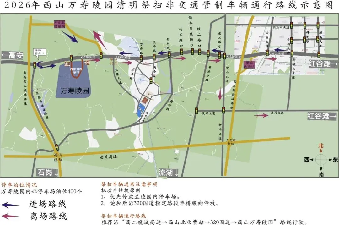 推荐沿“西二绕城高速→西山北收费站→320国道→西山万寿陵园”路线行驶。