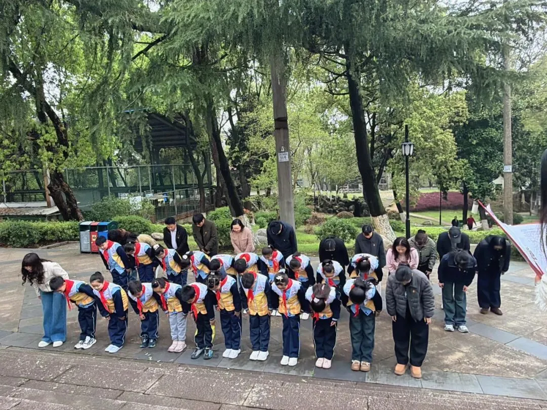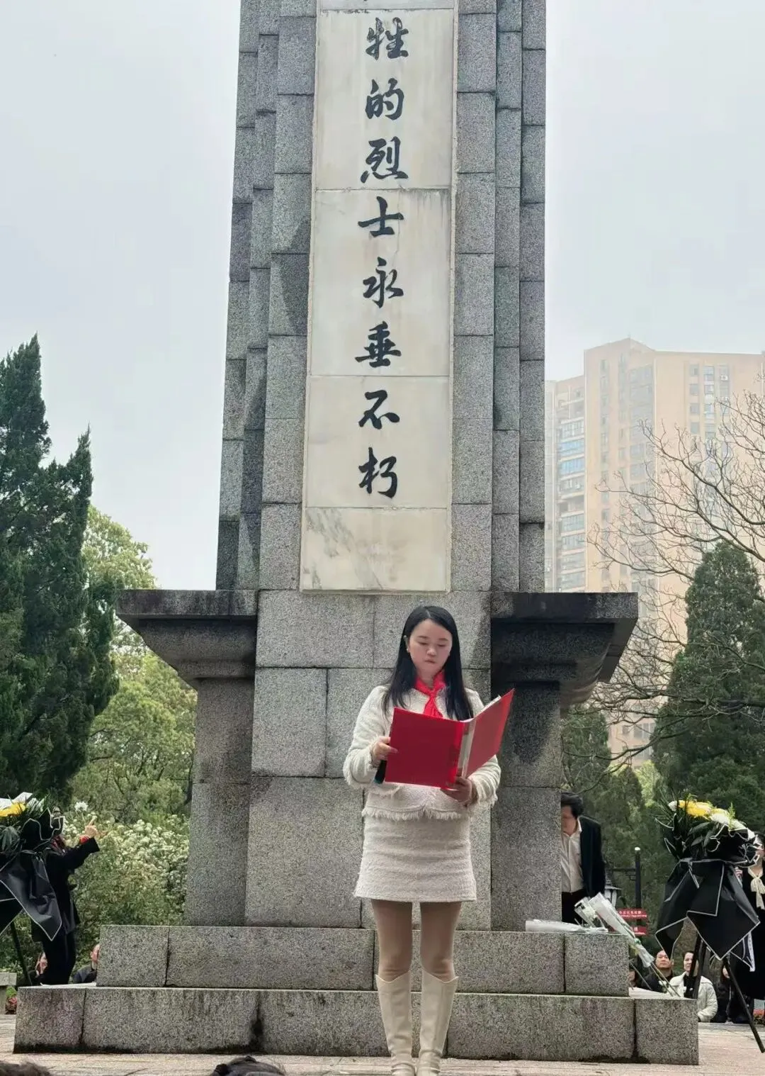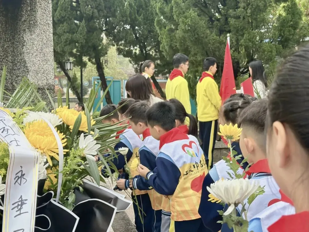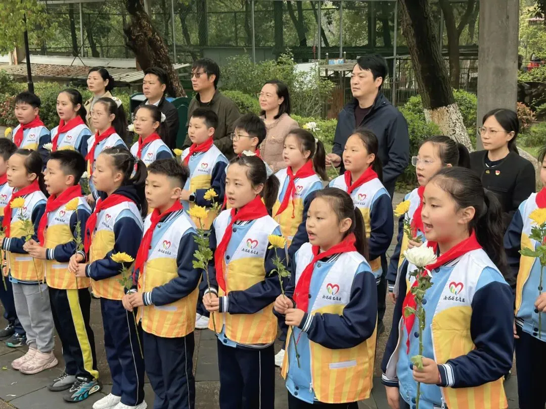 抵达纪念碑广场后,全体师生肃立就位,祭奠仪式正式拉开帷幕。活动由学校少先队辅导员陈丽主持,全程庄严肃穆、秩序井然。随着铿锵嘹亮的出旗曲响起,少先队仪仗队整齐出旗,全体少先队员立正敬队礼,崇高敬意油然而生。随后,全体师生齐声高唱《中华人民共和国国歌》,雄浑的歌声在纪念碑广场回荡,饱含着对祖国的热爱与对革命先烈的深切缅怀。紧接着,少先队员齐声献唱《我们是共产主义接班人》,稚嫩而坚定的歌声,传递着新时代少年儿童传承先烈精神、立志报效祖国的坚定信念。
