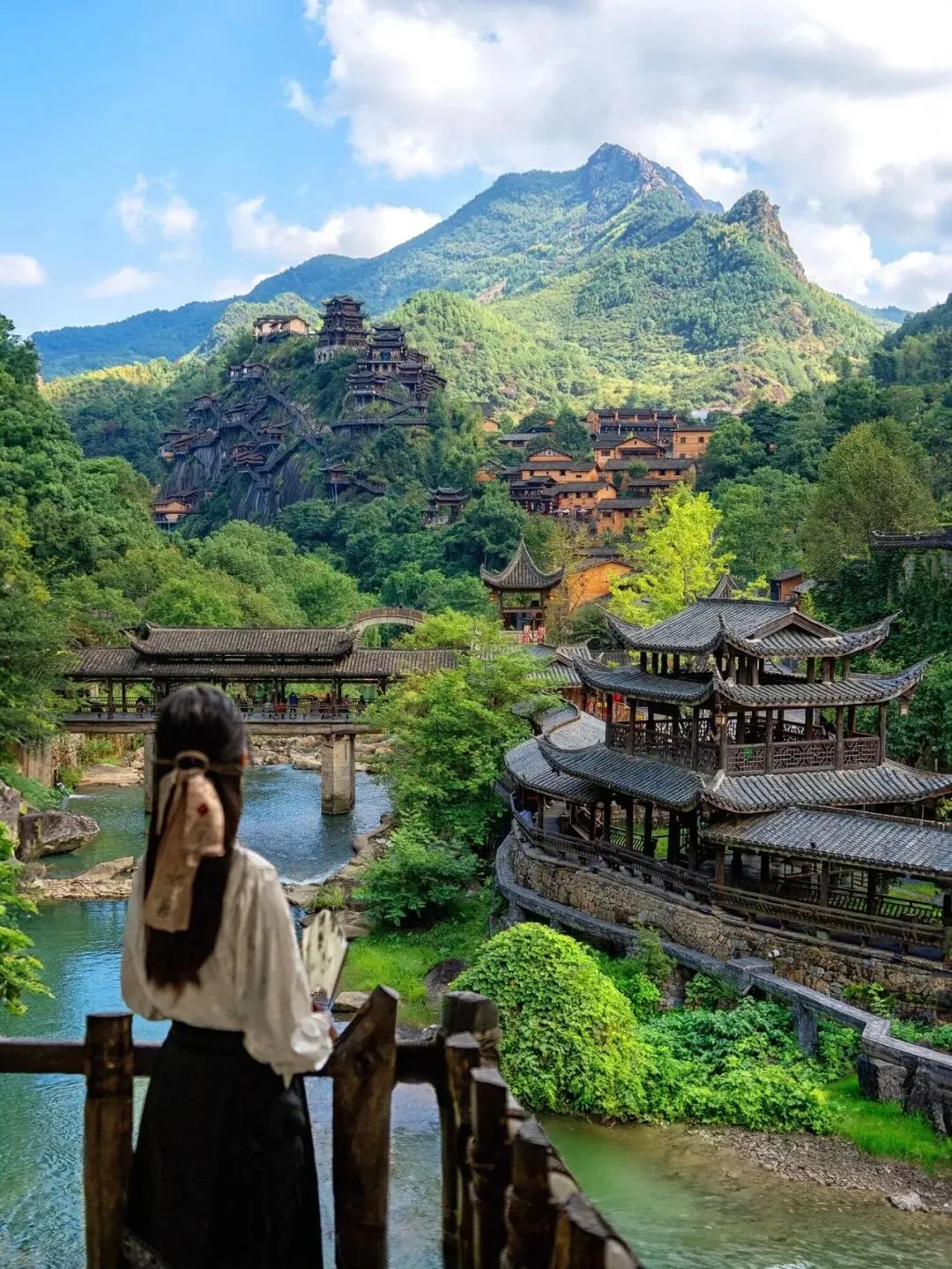 之后【寻仙路】过了青云桥,再踏青云梯,从此鸿运当头,我们现在走的这条栈道叫寻仙路,既有青石板路,也有峡谷栈道,顺应天然地形,曲折回转,蜿蜒在九牛峡谷之中,山里步道从古至今用的都是这种很粗糙的毛石,具有防滑作用,这也是古代工匠智慧的体现,沿途鸟声啾啾,水声潺潺,四时之景也各有不同【廊桥】沿河而建,是典型的江西风雨廊桥的形态,桥体采用了抬梁式架构,在立柱上架梁,梁上又抬梁,层层叠落一直到屋脊,各个梁头上再架上檩条同来承托屋椽,结构和工艺十分复杂(华灯初上,望仙谷夜景便出现在你眼前)