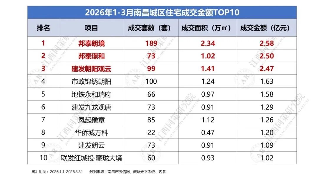 2026年1季度南昌城区及各板块房地产市场成交排行榜