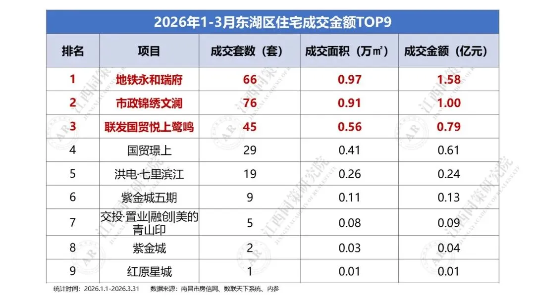 2026年1季度东湖区商品住宅成交金额前三分别为地铁永和瑞府、市政锦绣文澜及联发国贸悦上鹭鸣,区域TOP9门槛为0.01亿元。二、2026年1季度西湖区住宅成交金额排名