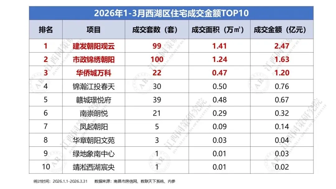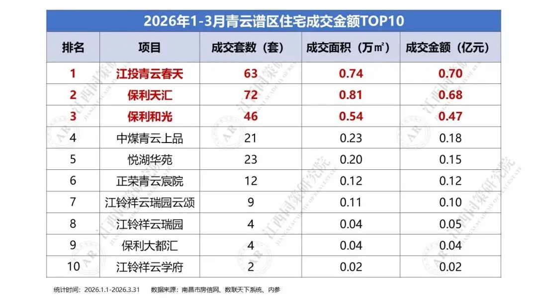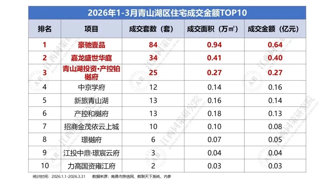 2026年1季度西湖区商品住宅成交金额前三分别为建发朝阳观云、市政锦绣朝阳及华侨城万科,区域TOP10门槛为0.02亿元。三、2026年1季度青山湖区住宅成交金额排名