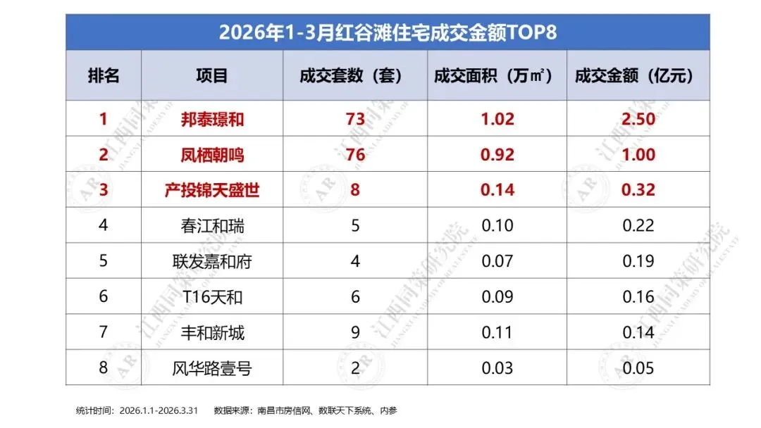 2026年1季度青云谱区商品住宅成交金额前三分别为江投青云春天、保利天汇及保利和光,区域TOP10门槛为0.02亿元。五、2026年1季度红谷滩住宅成交金额排名