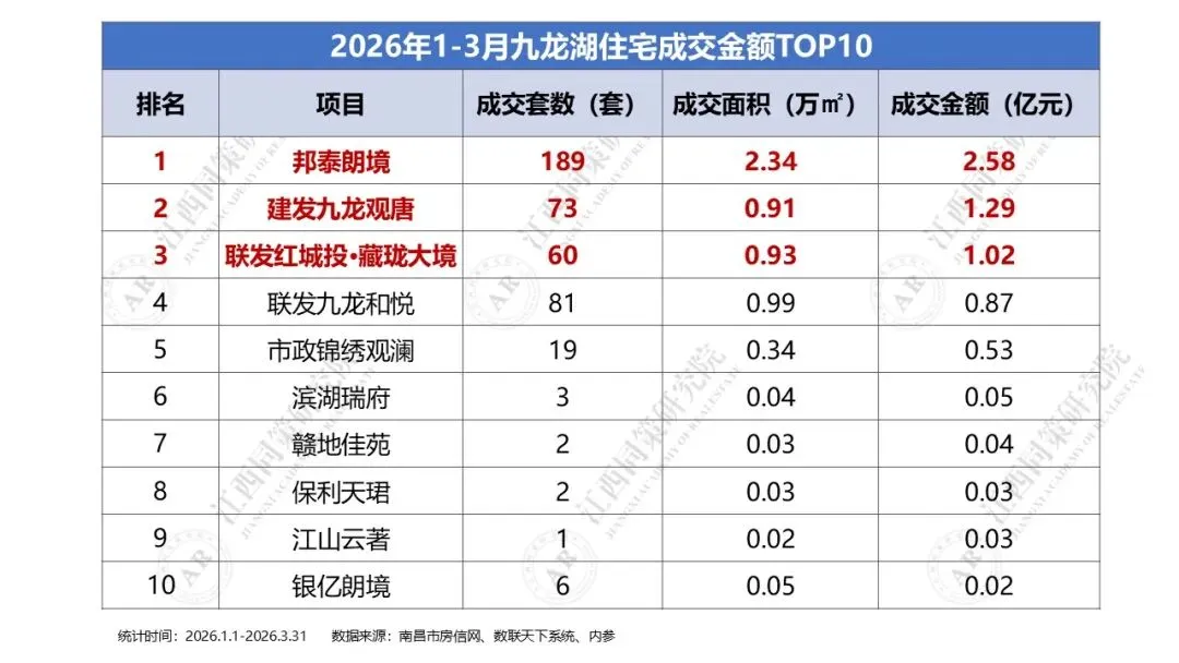 2026年1季度,南昌城区商品住宅成交金额前10分别为邦泰朗境、邦泰璟和及建发朝阳观云,TOP10门槛为1.02亿元。一、2026年1季度东湖区住宅成交金额排名