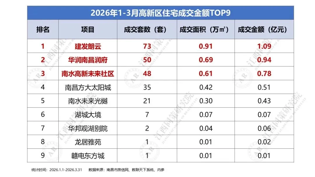 2026年1季度高新区商品住宅成交金额前三分别为建发朗云、华润南昌润府及南水高新未来社区,区域TOP9门槛为0.01亿元。八、2026年1季度经开区(含赣江新区)住宅成交金额排名