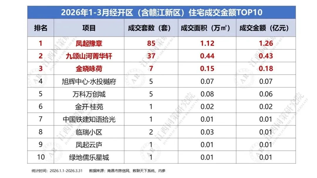 2026年1季度经开区(含赣江新区)商品住宅成交金额前三分别为凤起豫章、九颂山河菁华轩及金晓咏荷,区域TOP10门槛为0.01亿元。九、2026年1季度湾里住宅成交金额排名