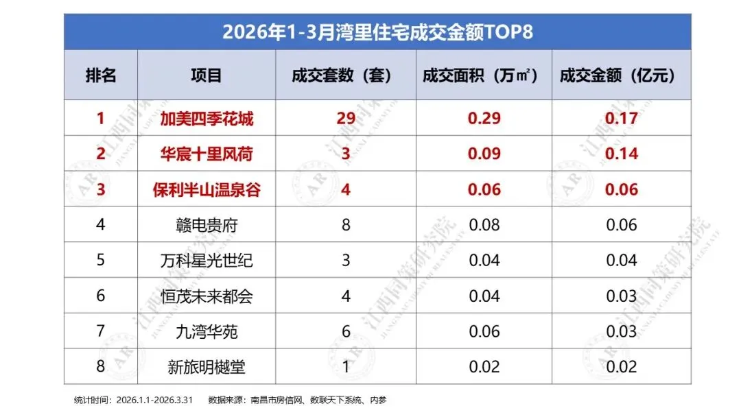 2026年1季度湾里商品住宅成交金额前三分别为加美四季花城、华宸十里风荷及保利半山温泉谷,区域TOP8门槛为0.02亿元。