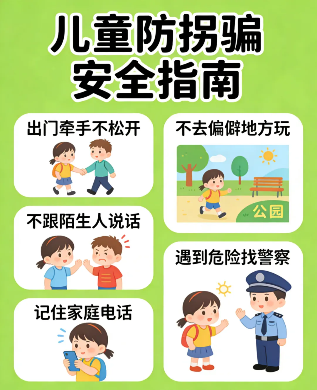 家长们提醒孩子在公共场所,加强自我防范,防止被人拐骗,外出一定要有家长陪同,保管好随身携带的物品,同时还要向孩子介绍一些如何提防陌生人、如何防盗等方面的知识。