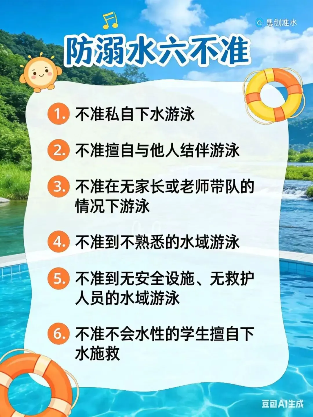 随着天气日渐炎热,需强化防溺水安全宣导与监护措施,要求孩子切实履行"六不准"规范:1.严禁擅自单独下水游泳;2.禁止私自组织同伴共同游泳;3.不在无家长或教师带领的情况下游泳;4.拒绝进入缺乏防护设备及专业救护人员的危险水域;5.不到陌生的水域游泳;6.学生禁止擅自实施涉水救援行为。