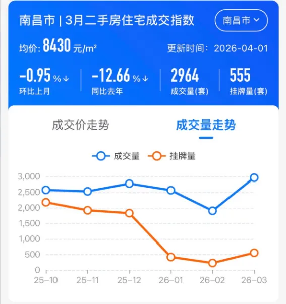 数据显示,南昌二手房市场整体延续了年初以来的火爆开局,3月成交量是创历史新高的,实际成交量远超 3000 套,挂牌量在逐步下滑收缩,距离筑底价稳不远了。