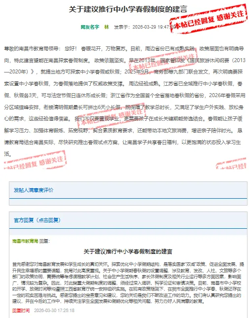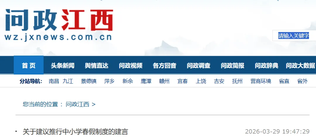 近日,有网友在问政江西提出关于建议推行中小学春假制度的建言。