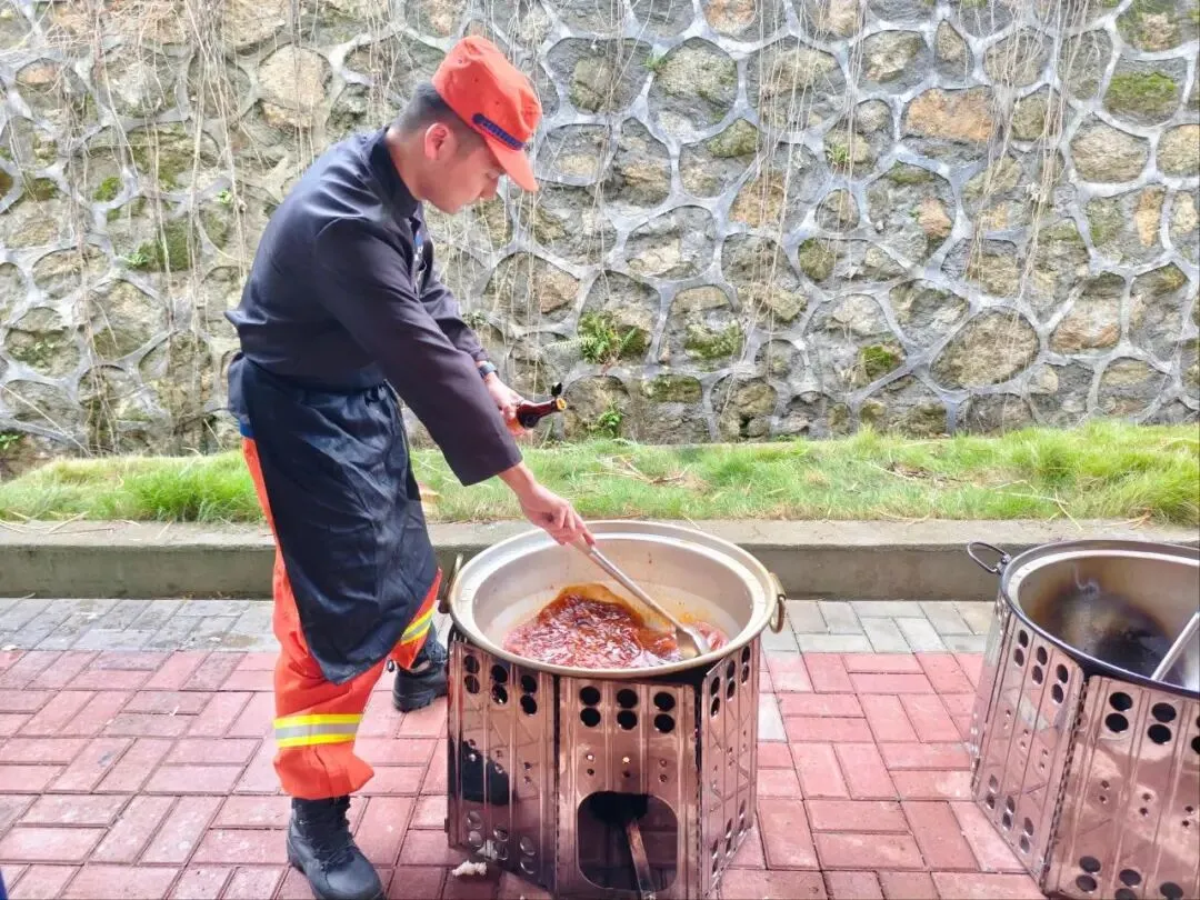 驻训之初,各级党组织便将思想发动贯穿全程,深入搞好动员教育,引导全体指战员在野外艰苦条件下始终保持昂扬斗志。从指挥所高效运转到宿营区规范管理,从炊事保障到车辆调度,各项工作有条不紊。野外宿营区,帐篷搭建整齐划一,生活物资保障到位;炊事区,野战炊事装备高效运转,确保指战员热食供应;车辆停放区,各类救援车辆按战斗编组有序停放,随时保持出动状态。针对野外驻训环境复杂、气候多变等特点,支队还加强安全风险评估,制定应急预案,确保驻训全程安全可控。