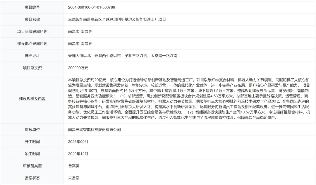 近日,江西省投资项目在线审批监管平台公示了三瑞智能南昌高新区全球总部创新基地及智能制造工厂项目备案信息,项目编号2604-360100-04-01-508786。