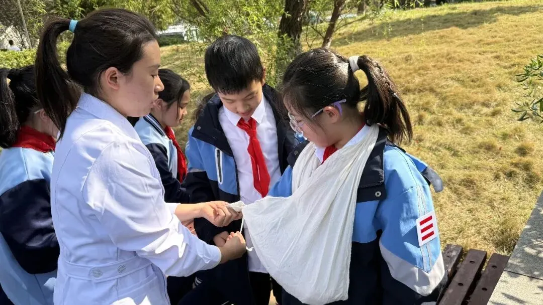 活动现场庄严肃穆,全体人员肃立奏唱国歌,向革命先烈默哀并敬献鲜花,以寄哀思、表敬意。在鲜红的党旗与队旗引领下,全体党员在党支部书记、校长徐耀志的带领下重温入党誓词,少先队员重温入队誓词,铿锵誓言凝聚起校医双方“不忘初心、共担使命”的思想共识。仪式上,学校与共建支部代表先后发言,一致表示将依托教联体平台,以红色精神为引领,推动思政教育与科创教育深度融合。学生代表分享感悟,表达了传承红色精神、深耕科创实践的决心。活动期间,医护人员还带来医疗急救科普小课堂,既提升师生安全自救能力,也为教联体医教协同、科创育人积累了实践经验。