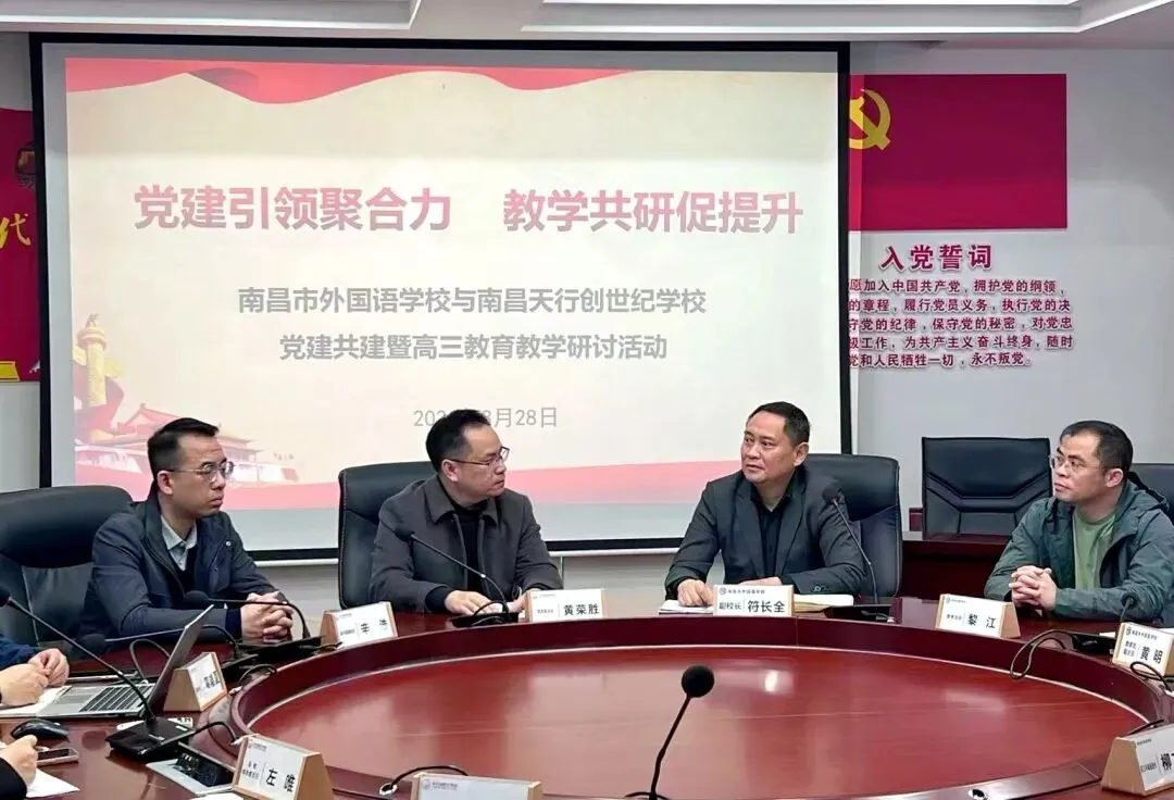 春山可望,备考正忙。为精准研判2026届高三南昌市一模考试成效,破解复习备考中的难点、堵点问题,科学优化二轮复习策略,3月28日,南昌外国语学校高三全体教师在学校领导的带领下,赴党建共建学校天行创世纪学校开展主题为“精析一模、聚力二轮、共促提升”的专题研讨活动。天行创世纪学校党支部书记黄荣胜、高中副校长辛浩、高三年级组长乐嘉盛、总校综合办主任左唯、党务办主任廖晓夏热情接待了我校教师一行,春山可望,备考正酣。两校教师齐聚一堂,共研备考、共谋发展。