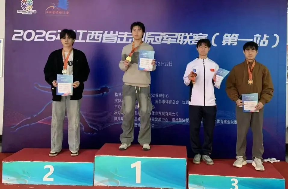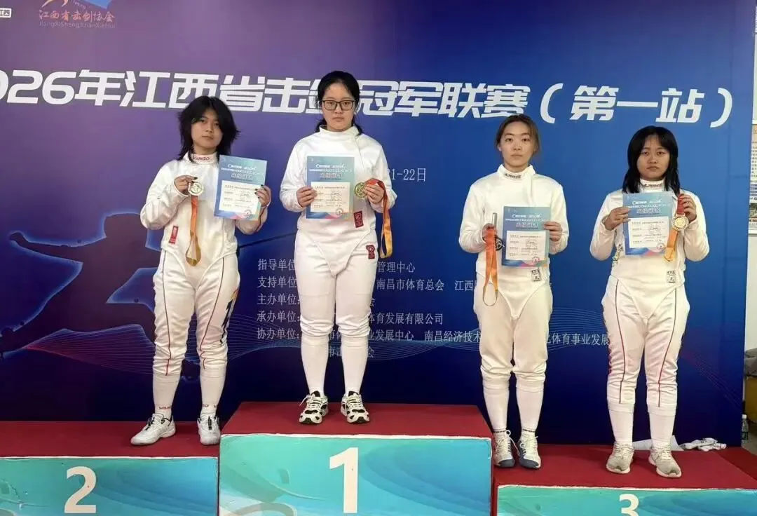 3月,2026年江西省击剑冠军联赛第一站(南昌站)在江西财经大学枫林体育馆圆满落幕。我院击剑社学子在指导老师吴超群悉心指导、社长罗薇带队出征的全力保障下,奋勇拼搏,一举包揽女子重剑个人前三名、男子佩剑个人前三名,用亮眼战绩展现出扎实的竞技实力、昂扬的体育精神,践行了江西财经大学信敏廉毅的校训,彰显了体育学院“完全人格,首在体育”的院训内核。