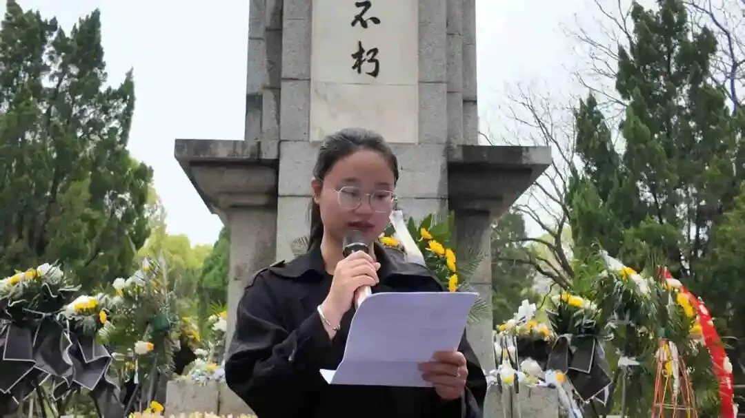 教师代表黄颖现场讲述南昌地区抗日英雄的英勇事迹,带领同学们重温烽火岁月,感悟革命先辈的坚定信仰与无畏气概。学生代表李雅琪发言表示,将铭记先烈遗志,勤奋学习、砥砺品格,努力成长为担当民族复兴大任的时代新人。
