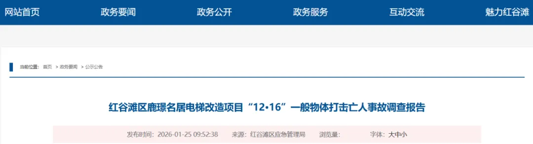本次事故为南昌市红谷滩区一老旧小区电梯更新改造项目,由洪*电梯有限公司承包施工。2025年12月16日8时许,4名工人在该小区A栋电梯井开展安装调试作业,其中2人在21楼轿顶校正、2人在井道底坑安装缓冲器,属违规交叉作业。轿顶作业的钱某将锤头竖直放置在钢梁上,弯腰取水时腿部触碰导致锤头坠落,砸中底坑作业的张某头部,安全帽破裂,张某经送医抢救无效死亡,事故造成直接经济损失约180万元。